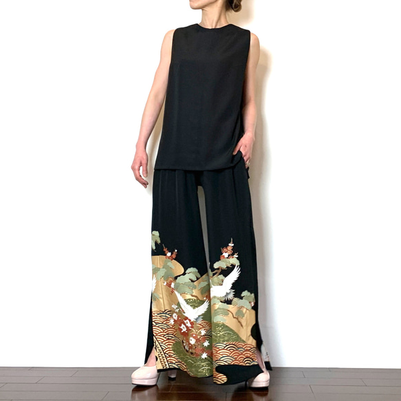 | 商品の特徴 | 着物リメイク 留袖 ワイドパンツのセットアップ ロングパンツ komomo。最新作 27 留袖ワンピース セット 着物リメイク 留袖 卒業式 結婚式。着物リメイク 留袖からパンツスーツ 3点セットの通販 by のんな's shop。型紙いらずの着物リメイク 1枚の着物でセットアップ: 着物地使いきりで。着物リメイク 留袖リメイク パンツセットアップ ワンピースシルク トップス 脇下身幅…56cm 肩幅…44cm 袖丈…50cm 袖スリット部分… 12cm 身頃スリット部分…57cm トップス総丈…106cm 前身頃すそ幅…68cm 後ろ身頃すそ幅…68cm パンツ ウエスト…60cm〜120cm ヒップ…120cm股上…35cm 股下…60cm わたり…70cm すそ幅平置き…34cm ストール 15cm×136cm リメイク後は未使用なので新品未使用とさせていただきました 黒留袖からリメイクしたパンツセットアップ フォーマルなイベントなどさまざまな場で最適です ネックレスは付いておりません | ||