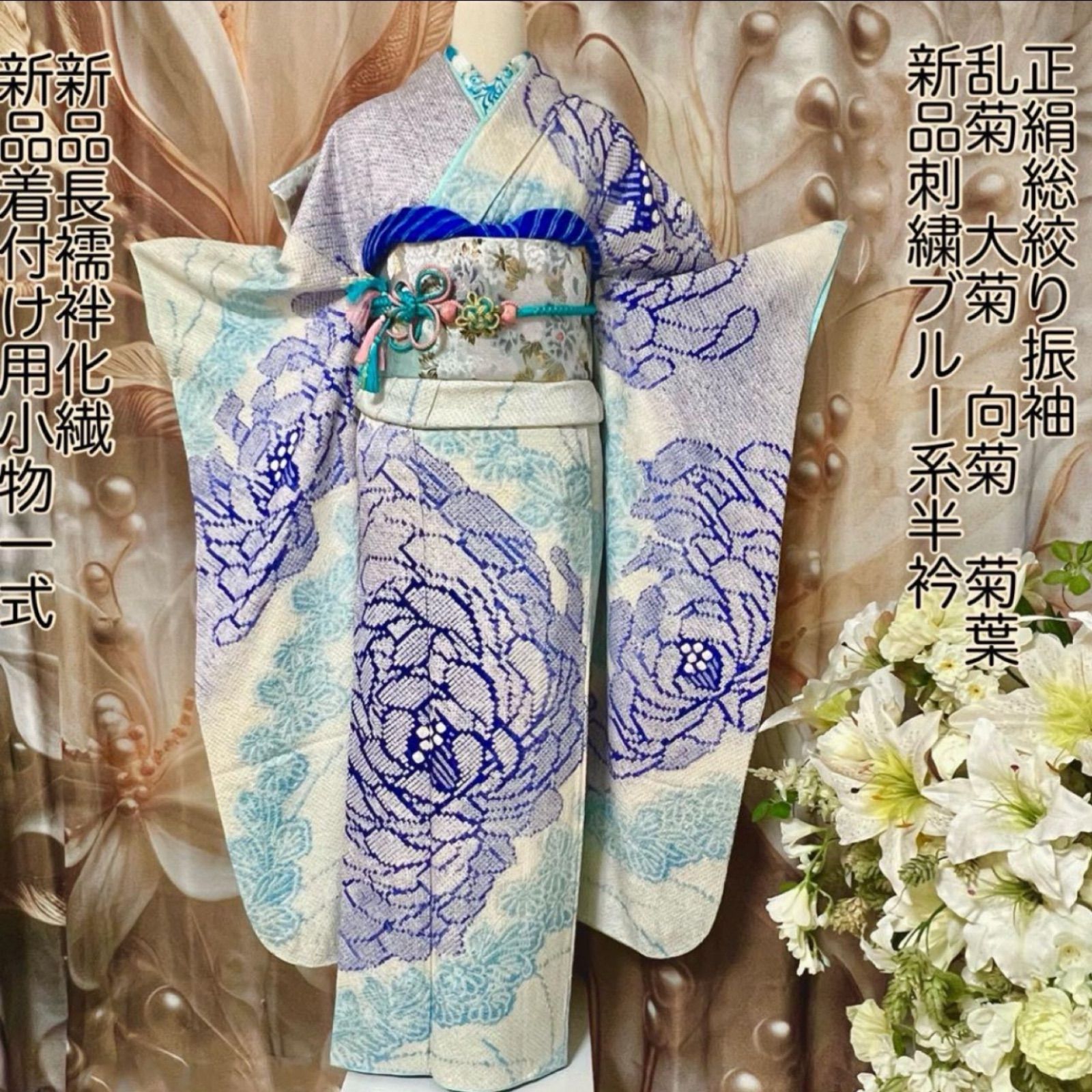 | 商品の特徴 | 正絹 振袖フルセット ブルー系 総絞り。正絹振袖着物 最終価格。楽天市場】【成人式 振袖 レンタル】RS702 正絹 黒 総絞り 波頭に牡丹。ご覧いただきありがとうございます。振袖フルセットM〜L6点セット12800円☆売り切れ終了。適応身長160センチ〜168センチ⭐︎セット内容振袖絞り正絹(美品)西陣袋帯正絹(美品)長さ 450cm 幅 31cm程長襦袢(美品)帯揚げ(美品)帯締め(新品)髪飾り(美品)身丈 165.5cm(肩から)裄丈 67cm袖丈 107.5cm 縫込み 8cm袖幅 35cm前幅 24cm後幅 29.5cm着物縫いこみ内揚げ 4cm裄お袖側 約0cm 身頃側 約1.5cm。672.正絹振袖総絞り風、白黒、165ぐらい。ミ*イ様 正絹菅原工房漢方紬未使用しつけ付き | ||