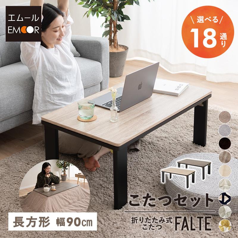 | 商品の特徴 | EMOOR(エムール) こたつセット 幅90cm 長方形 折りたたみ こたつ。EMOOR(エムール) こたつセット 幅120cm 長方形 折りたたみ こたつ。EMOOR(エムール) こたつ テーブル 長方形 90cm 折りたたみ 折れ脚。引っ越しのため出品いたします。EMOOR(エムール) こたつ テーブル 長方形 90cm 折りたたみ 折れ脚。■こたつテーブル約幅120×奥行79×高さ37.5cm折りたたみ時:約幅120×奥行79×厚さ10.5cm天板/脚:合成樹脂化粧繊維板ヒーター:メトロ電気工業製 MSU-501H(B) 510W発熱体:U字型 石英管ヒーター温度調節:温調ツマミ無段階可変式安全装置:温度ヒューズ/電流ヒューズ電源コード:丸打ちコードタイプ/電源スイッチ付き重量:約22.5kg(天板:約6.9kg)耐荷重:約20kg特徴···脚折りたたみ可利用人数···4人向け | ||