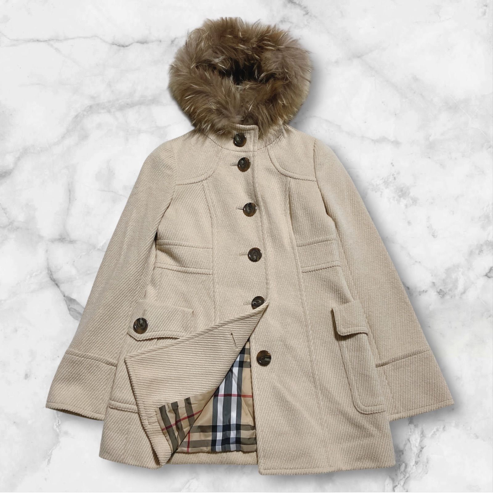| 商品の特徴 | バーバリーブルーレーベル ウールコート メガチェック アンゴラ 40。美品☆バーバリーブルーレーベル アンゴラ コート メガチェック。バーバリーブルーレーベル ロングコート アンゴラ混 裏地ノバチェック。【正規品】【即購入歓迎】【値下げ交渉可】【希少】アンゴラ混の柔らかい手触りのコートです!切り替えがありスタイルアップ効果があります!女性らしいシルエットのAラインに加えて、希少なメガチェックが随所からチラリと見えてオシャレ✨●商品名 BURBERRY BLUE LABEL バーバリーブルーレーベル ノバチェック メガチェック Aライン ロング丈 切り替え ウールコート ロングコート ベージュ系 レディース 大きめサイズ襟の裏や袖ベルト後ろのベルトの裏側にもノバチェックが施されており高級感を感じるコートです✨メガチェックはレアで人気があるので早い者勝ちです✨●サイズ 表記:40サイズ(Lサイズ相当)着丈95cm身幅44cm肩幅38cm袖丈60cm※平置き実寸●素 材 ウール 60%アンゴラ 40%●カラー ベージュ系キャメル※画像4枚目が実物に近いお色です素人撮影なので、実際の色と若干の差が出てしまう可能性があることをご了承ください。ファー不要の方にとっては格安で購入するチャンスです‼️多少の使用感はありますが、目立った傷や汚れは見当たらずまだまだ長く着用いただけます!感じ方には個人差がありますので、全体の状態は画像を良くご確認ください。※商品に関する質問などはお気軽にコメント欄にてお知らせください!【発送について】小さめに畳んでの発送となります。。美品 バーバリーブルーレーベル アンゴラ コート メガチェック 40。●状 態 ファー欠品の為お安く出品しております。【今季未使用】To b. by agnès b. シャギーピーコート。エンフォルド/ENFOLDピーコト。あくまでも中古品であることをご理解いただける方のご購入をお願い致します。ジャケット・アウター Proust Wool-Blend Melton Coat。未使用 エブール ebure ライトグレーコート。ご理解いただける方のご購入をお願い致します。新品 スローブイエナ スイビダブルクロス ノーカラーダブル前コート サイズ38 | ||