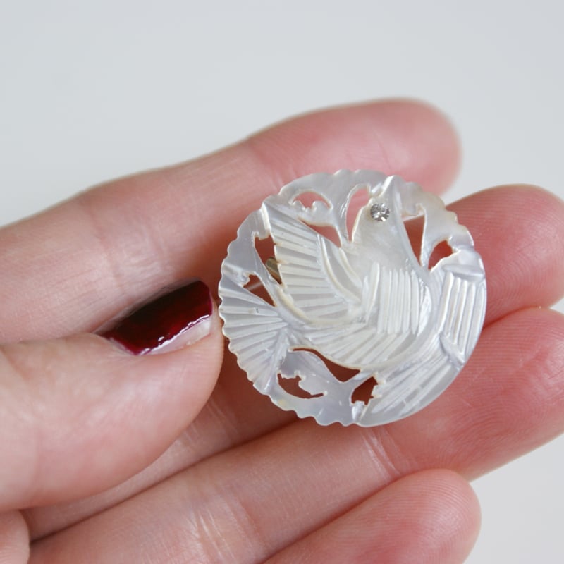 | 商品の特徴 | ベツレヘムパール マザーオブパール ヴィンテージブローチ。ベツレヘムパール 鳩 シェル マザーオブパール ブローチ。bird brooch / マザーオブパールベツレヘムバードブローチ 白蝶貝 | cocon。1960年代物大きさは写真をご覧下さいヴィンテージ物ですのでご理解がある方のみお願いいたします。ベツレヘムパール ブローチ/ペンダントトップアンティークアクセサリー。#ヴィンテージ#アンティーク#ヴィンテージブローチ#アンティークブローチ#ベツレヘムパール#ブローチ#マザーオブパールVintage mother of pearl hand carved oval/oblong Palestinian Bethlehem brooch | ||