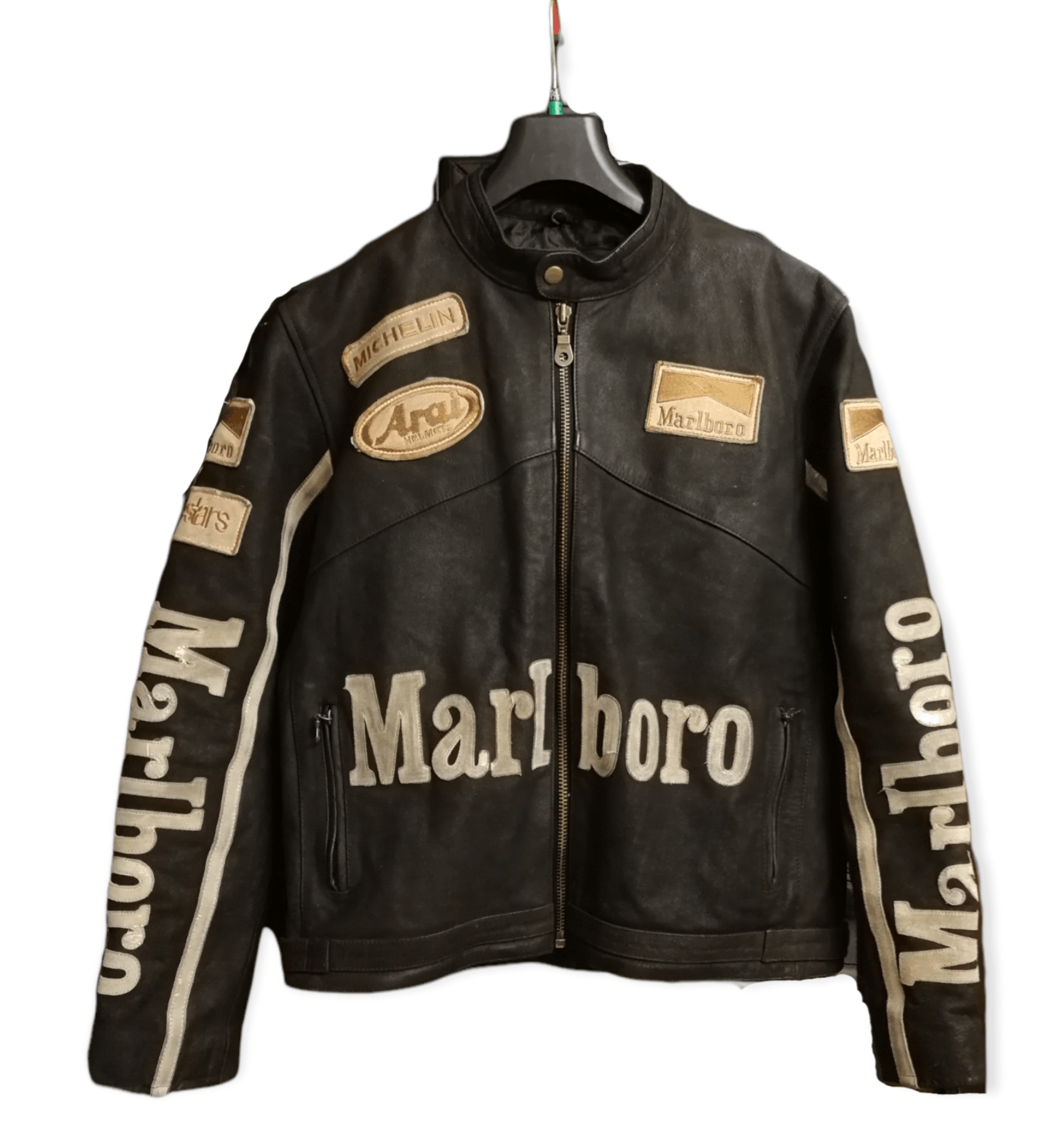 | 商品の特徴 | Marlboro Cow Leather varsity jacket。90s Marlboro Cow Leather Varsity Jacket。LEATHER VARSITY JACKET -A- ( TYPE-1 ) | WACKO MARIA(ワコマリア。平置き採寸肩幅57身幅63着丈70袖丈56マルボロのカウレザー(牛革)のヴァーシティージャケットになります。サイズ感も丈短めでストリートな着こなしからアメカジ寄り、グランジもいける幅広いスタイリングで使えます。90sのAVIREX復刻につき需要が上がってるレザーのバーシティ、被りづらく味のある古着で着こなしの幅を広げるのはいかがですか?ポケットのつき方、バックの折り返し部分、色味など最高です。自分はパーカーの上からガバッと着ていました着用の機会が減りこいつを着倒してくれるかたの手元にわたればなと思い出品に至りました。。Marlboro Cow Leather varsity jacket。極美品 FW21 AMIRI Bomber Jacket アミリ ジャケット。マインデニム 23AW ウールメルトンレザースタジャン。最終値下 ジービースポーツ Gbsport #89 スタジャン 裾リブなし XL | ||